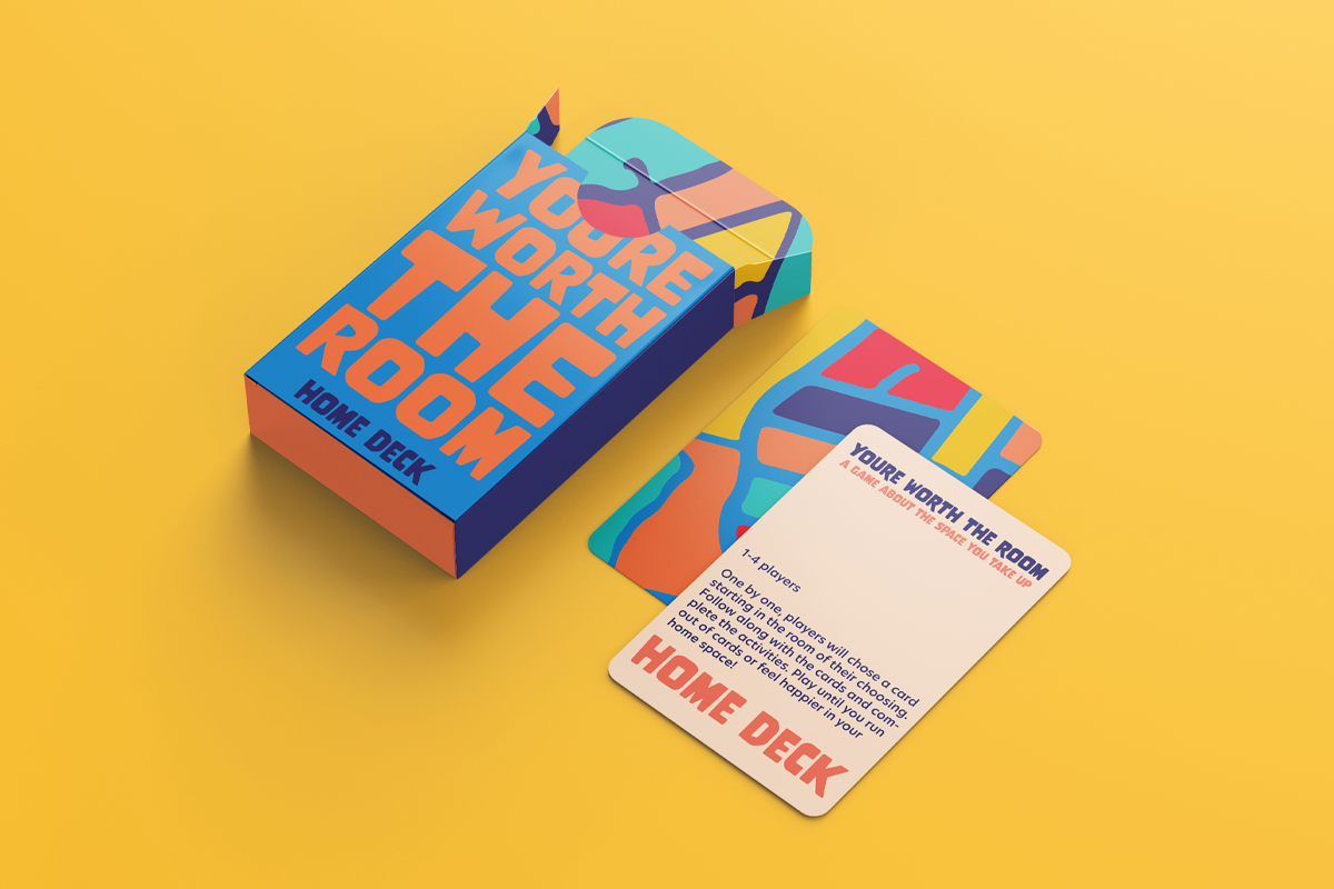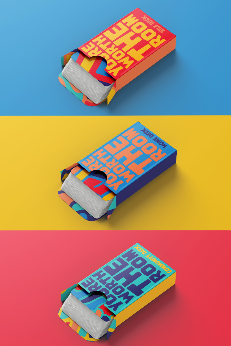 Here are a series of images visualizing the cards and packaging of You’re Worth the Room. The images describe 3 game packs to be played in order:
